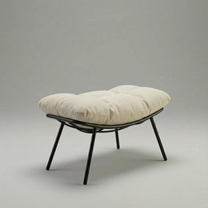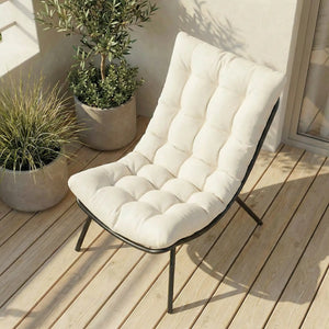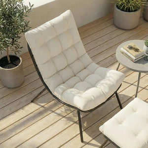 The set includes two comfortable lounge chairs, two matching Footstools, and a round side table, all built on a sturdy, rust-resistant steel frame. Each chair features dual-layer fabric with a soft sponge layer in between, offering enhanced comfort and support. The open-back design allows you to sit back and relax freely, without any metal pressure behind your back.